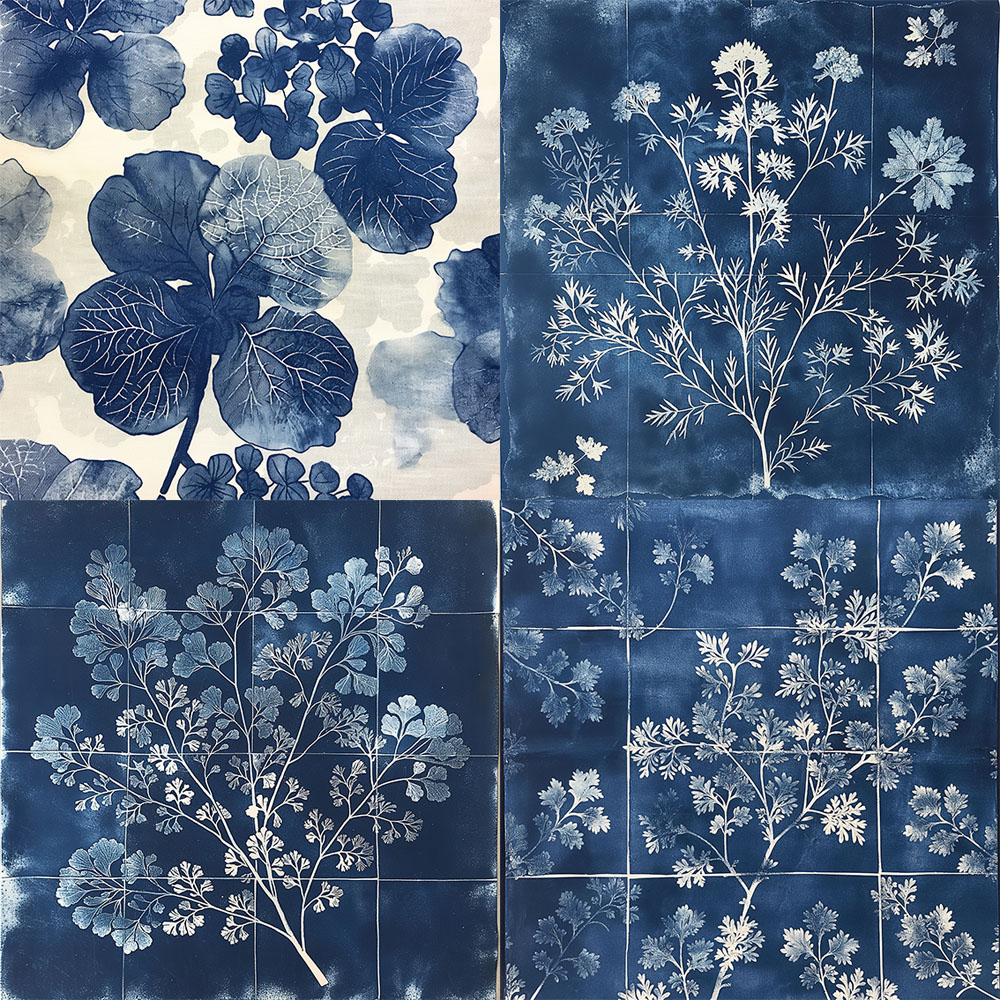 Unique artistic rendering inspired by Japanese cyanotypes and shibori