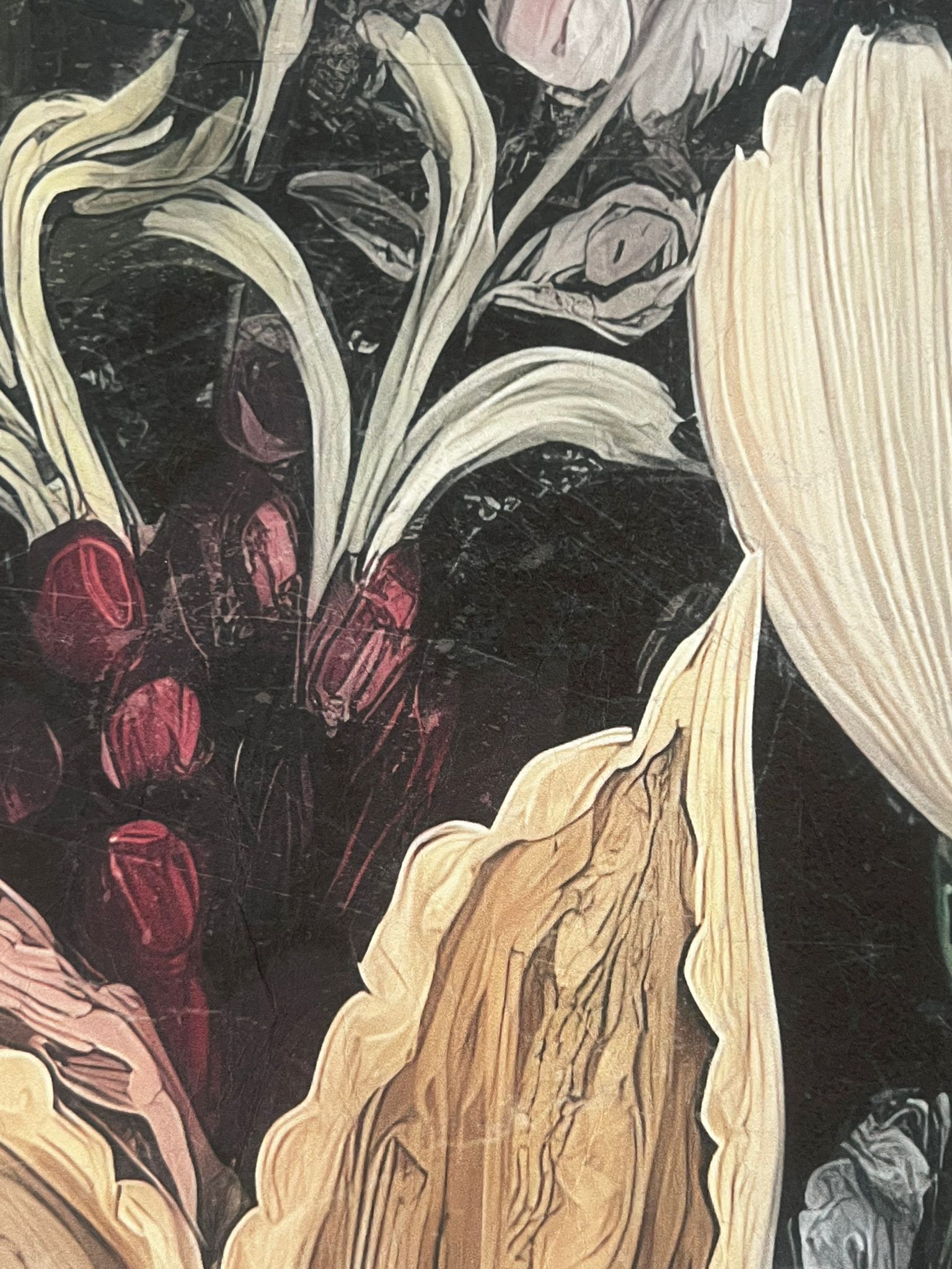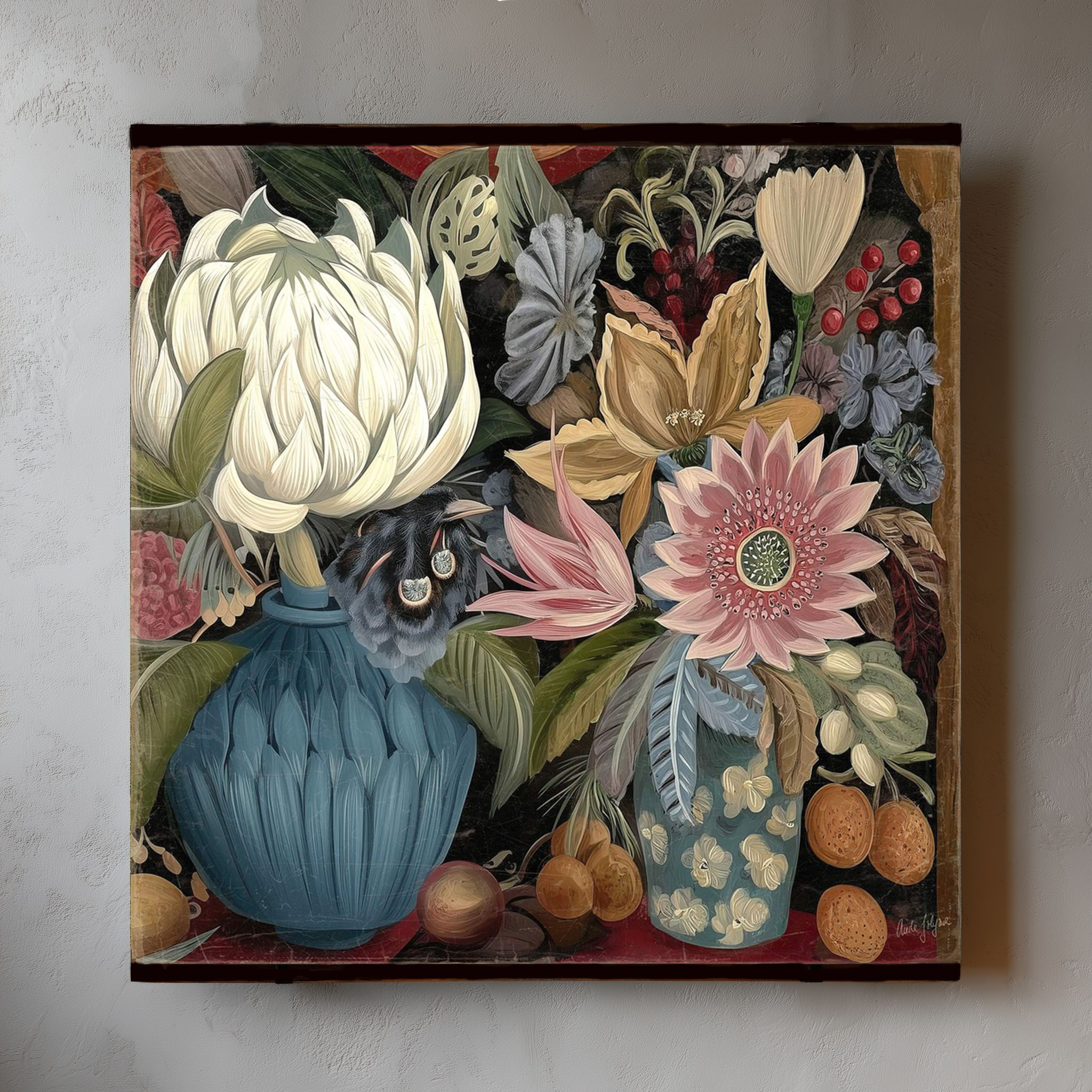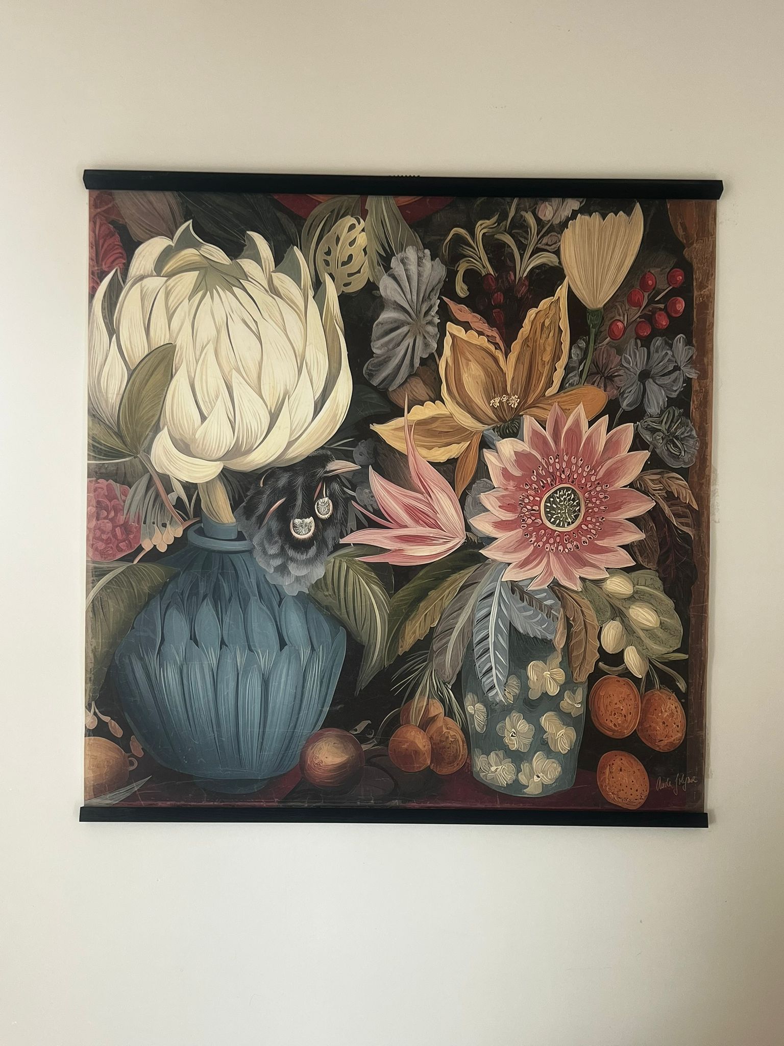 Toile murale artisanale unique à suspendre, représentant des fleurs et fait main.